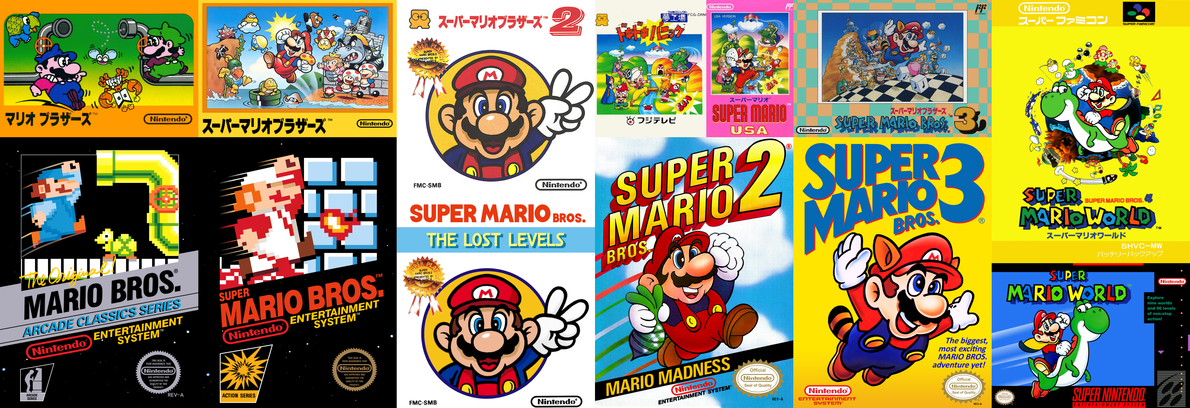 I made this collage a few weeks back, with Japanese box art on the top and North American box art on the bottom.  The Japanese like to show the world and a bunch of other characters - the North American ones just seem to show Mario jumping.